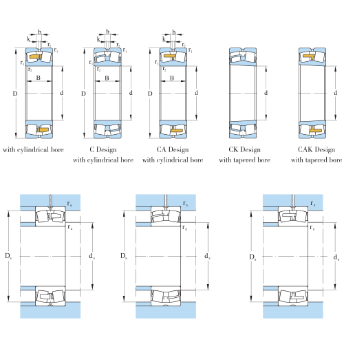 | C | C: Vòng cách bằng thép ép hai mảnh giữ con lăn đối xứng, dẫn hướng bằng gờ ở giữa ca trong |